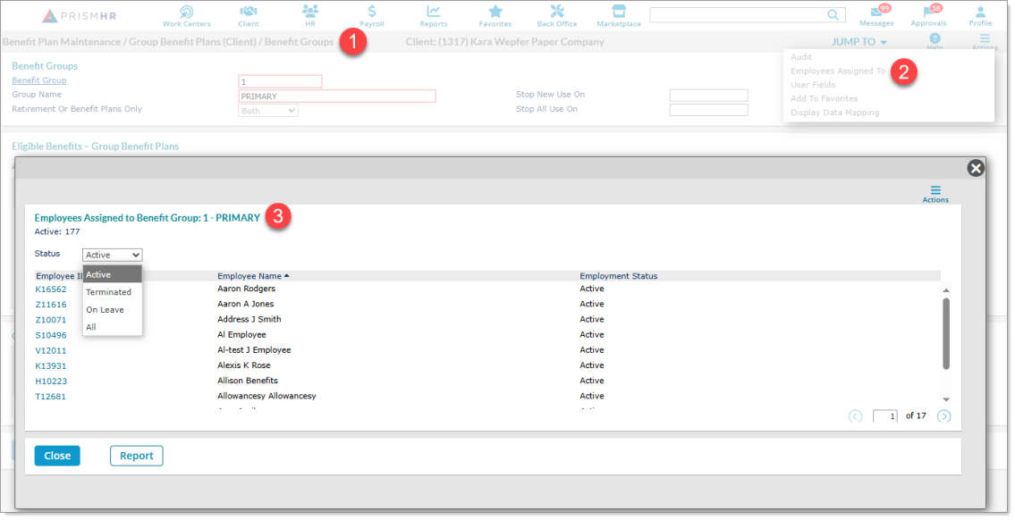 • | Employee Assigned To: Select this to view a list of employees at the company assigned to the benefit group. |