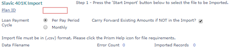 To upload a database file in .csv format and import its data, do the following in the Slavic 401K Import panel: