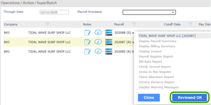 SuperBatch calculation: When you calculate a payroll with worksite approval setup using the SuperBatch form on the Operations|Action menu, the approval is generated after you select Reviewed OK during the Review step. Selecting this button triggers the approval and updates the payroll status to Client approval pending. For example: |
