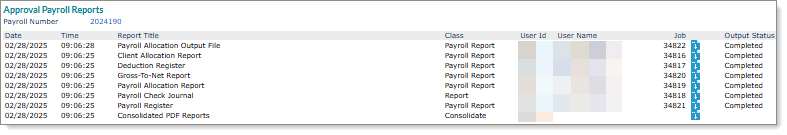 | • | If a payroll is in Completed (INIT.COMP) status, the reports display in the Payroll Reports form when you select the Reports icon ( |