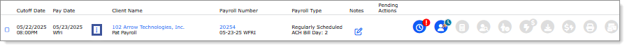 You can access payroll-related features for a payroll by clicking the links listed in the Client Level Actions area. For example, click the link in the Payroll Number column to open the Payroll Control form, which displays details about that payroll. (Each form opens as a layer over SuperBatch, so that you do not lose your place and can return to SuperBatch easily.)