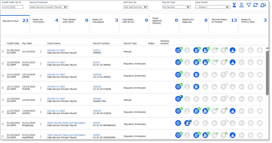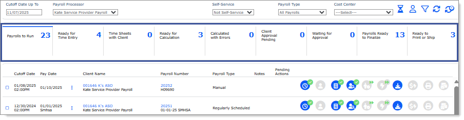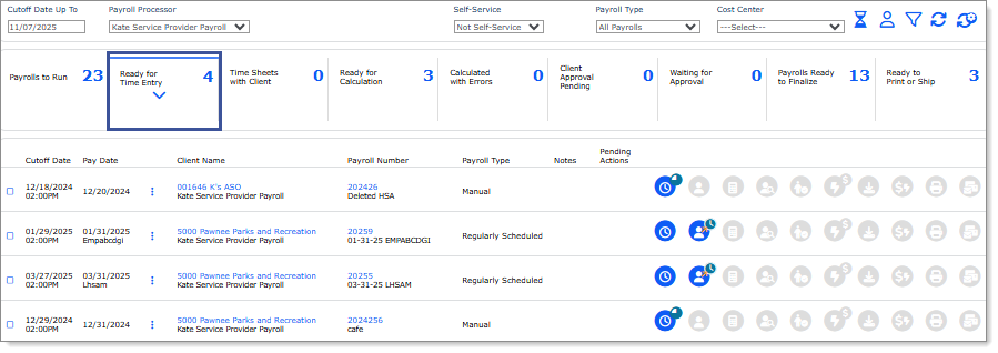 To further filter the payroll display, click a step in the ribbon to display all the payrolls in that step. (Some of these filters can include several statuses, which you can select as a group or individually.) For example, clicking Ready for Time Entry in the example above displays the payrolls matching that criteria:
